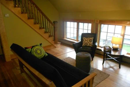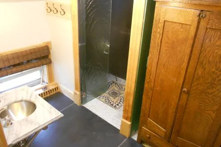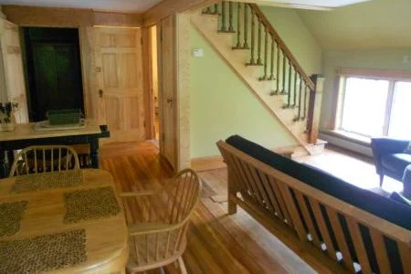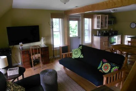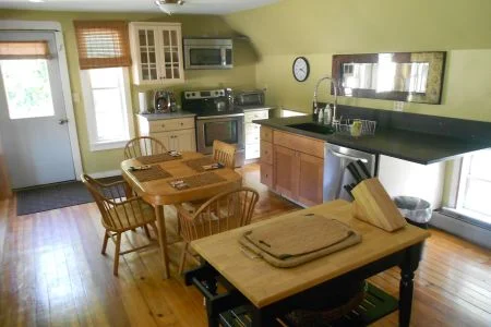 The Carriage House is our most private suite. The upstairs master bedroom has a king bed and new jetted tub on slabs of slate. The open floor plan on the entry level contains a spacious kitchen, living room, queen bedroom and full bath. Adjacent to the Carriage House are flower gardens and a fountain. Ideal for dog lovers, the original Carriage road is our private trail to Mt. Philo State Park through 100 year old black willows and sugar maples. Each suite receives our complimentary breakfast basket.